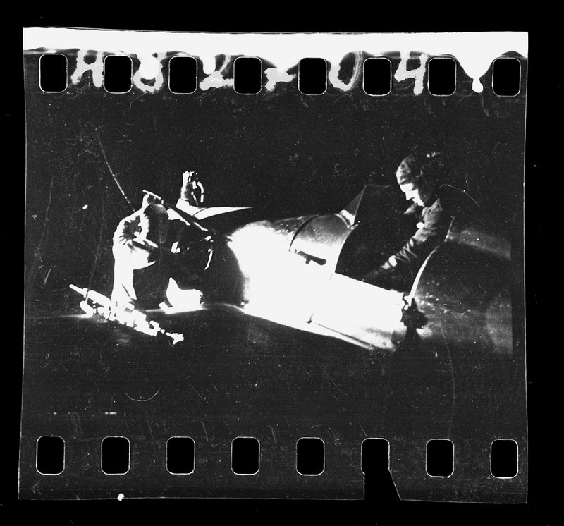Редкий негатив. Полевая установка пулемета ШКАС на крыле учебного УТ-2 превращенного в легкий ночной бомбардировщик. Отдельная эскадрилья легких ночных штурмовиков, Северо-кавказский фронт, 1942.