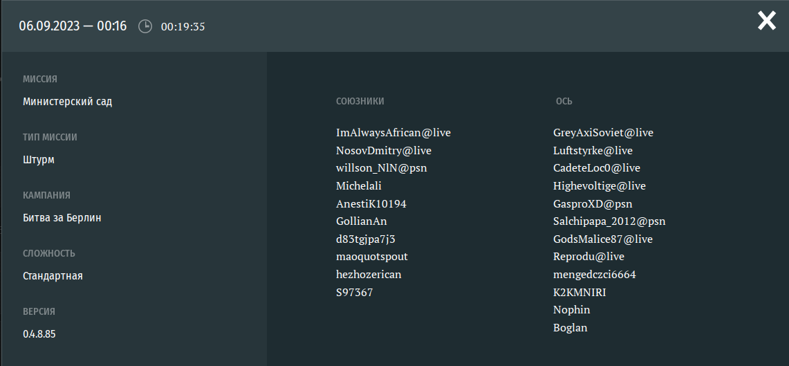 Кстати, залез поглядеть один повтор и решил глянуть заодно соотношение живых игроков за ось и за советы в берлине. Я не нашёл ни одного боя, где бы у оси было живых игроков столько же сколько и у советов. В большинстве случаев живых фашистов в 2 и БОЛЕЕ(!!!) раза больше чем живых советов. Случаев когда фашистов больше всего в 1,5 раза - единицы. Я вот задумался - это типичная ситуация для консольщиков и у бояр также?