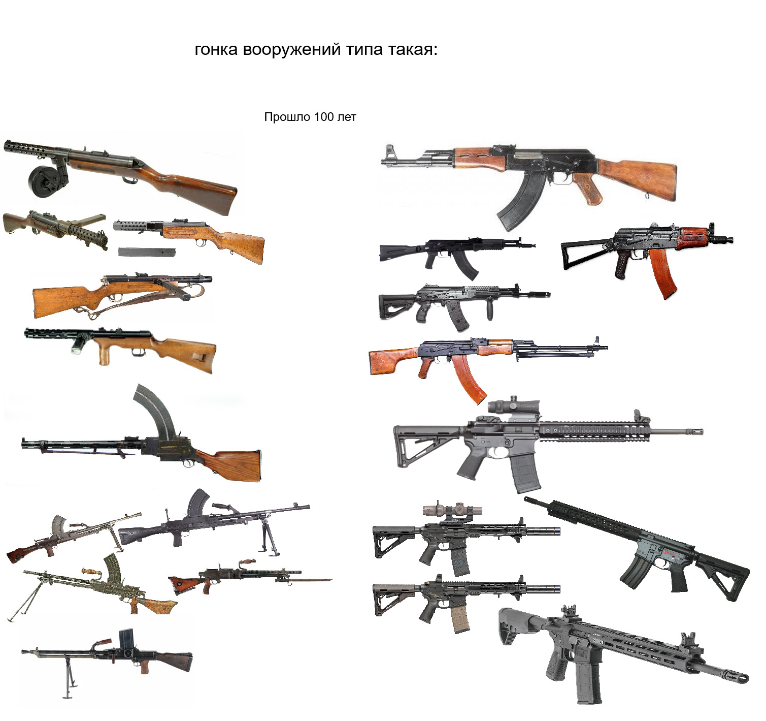 современные пулеметы ещё более или менее разные хотя прям таки массовых современных мало, а вот автоматов на базе АК или AR дофига прям как раньше было дофига переделок мп 18 и ZH26 (в контексте пулеметов я имел ввиду именно его, но мадсен был раньше поэтому изобразил именно его большим пулеметом)