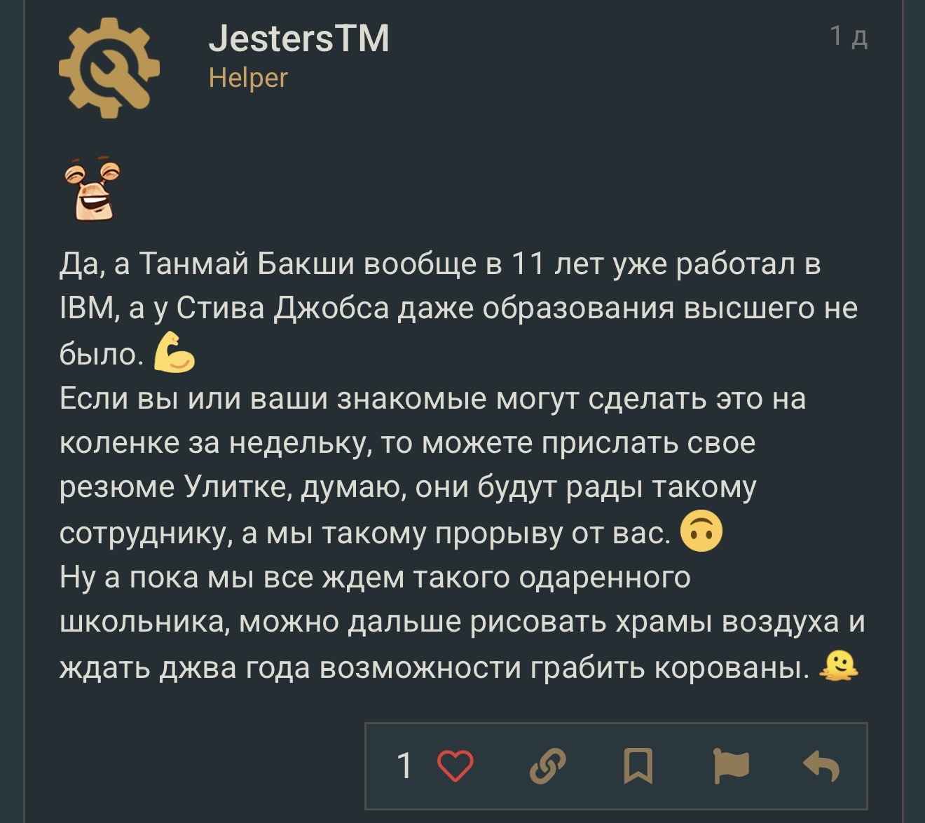 А поскольку выясняется, что(по мнению хелпера) улитки с радостью возьмут в штат школьника, умеющего в ифы,
