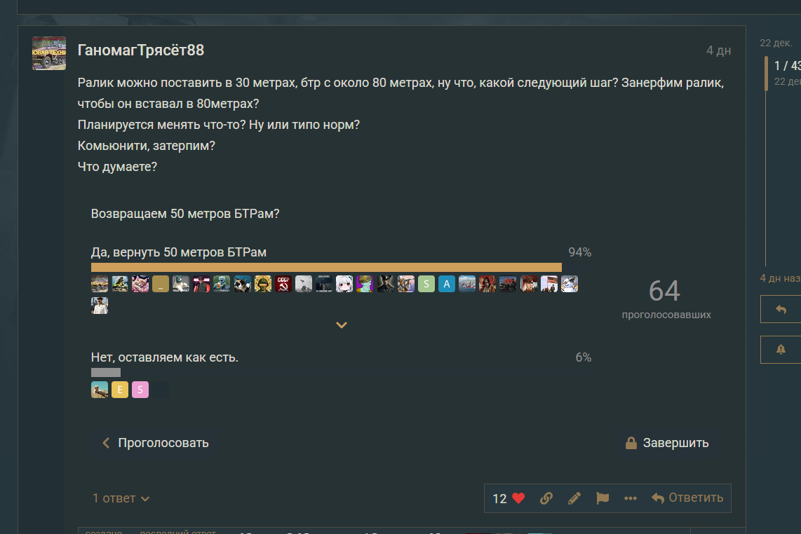 Просто я всегда писал, что БТРы одно из лучшех нововведений в игру, в плане геймплея, я очень их любил и хвалил, мне кажется увеличение расстояние сильно уменьшило их актуальность. Нужно менять.