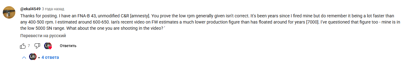 Напрямую о замедлителе не говорится в тексте (только то, что нет специальной отдельной конструкции для замедления темпа стрельбы), но описывается система полусвободного затвора с рычажным усилением инерции. Она и отвечает за замедление отпирания затвора. Интересно еще то, что на ютубе в комментариях к их видео был человек, который утверждал, что у него тоже есть fnab-43 и он у него выдает 600-650 в/м