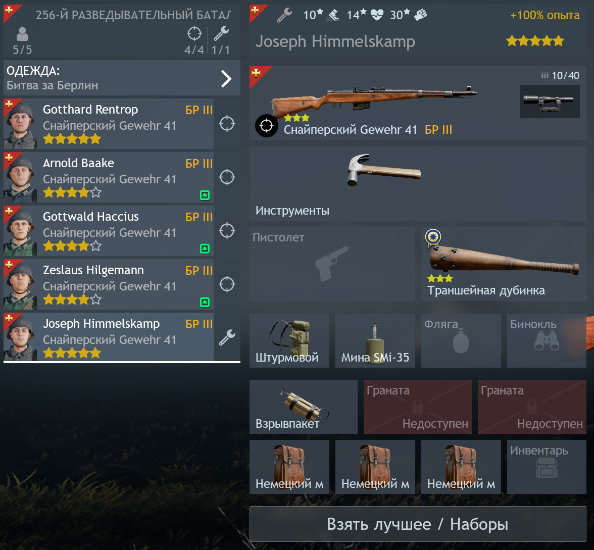 | Sniper Gewehr 41 | +1/-1/+6 | 6 | Снайпер2 | 7 | Снайпер2 |