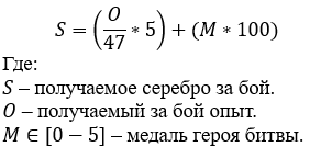 За каждые 47 полученного в бою опыта вы получаете 5 серебра. +по 100 серебра за медали героя битвы, не более 500 за бой.