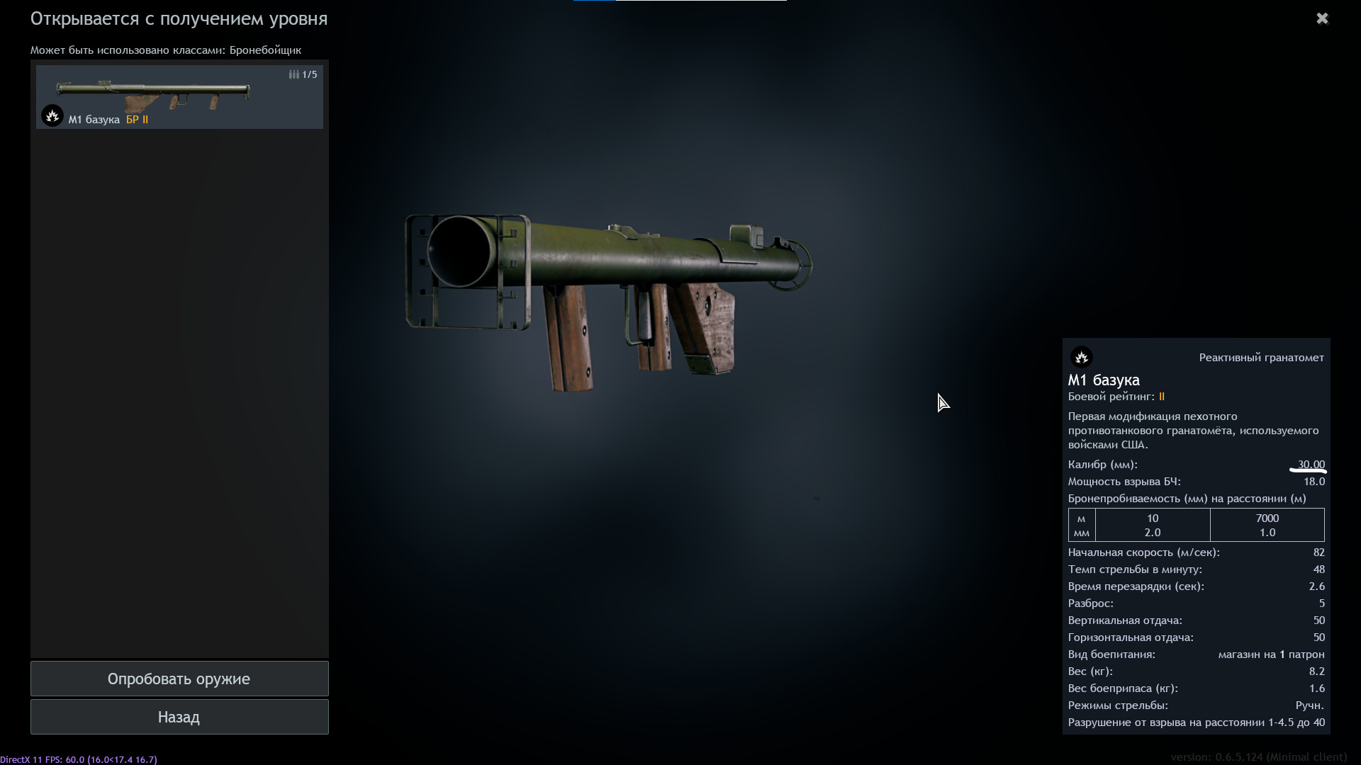 В данный момент у всех трёх базук (М1, Советская М1 и М9) в карточке написан калибр 30 мм, что неправильно. Предлагаю изменить на реальное значение в 60мм.