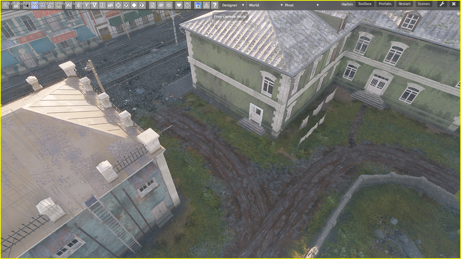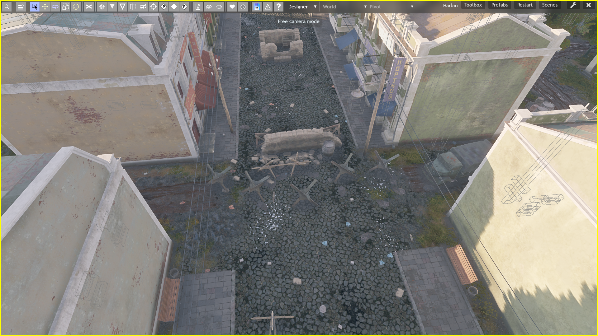 Возможное решение, поставить пару зданий за ангаром, а так же строение либо же камни в жёлтой зоне.