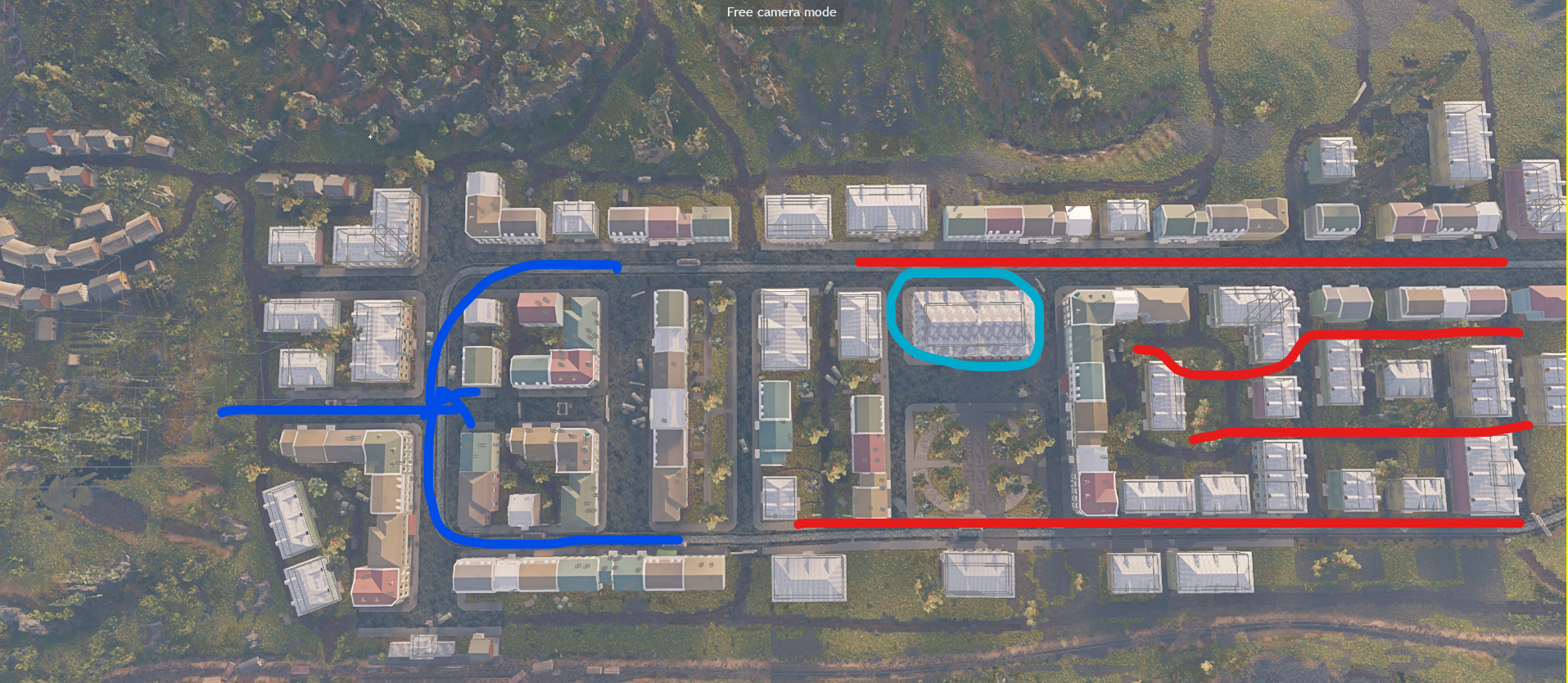 Команда синих в худшем положении из за ежей и строений что не дают напрямую проехать к точке, вот они.