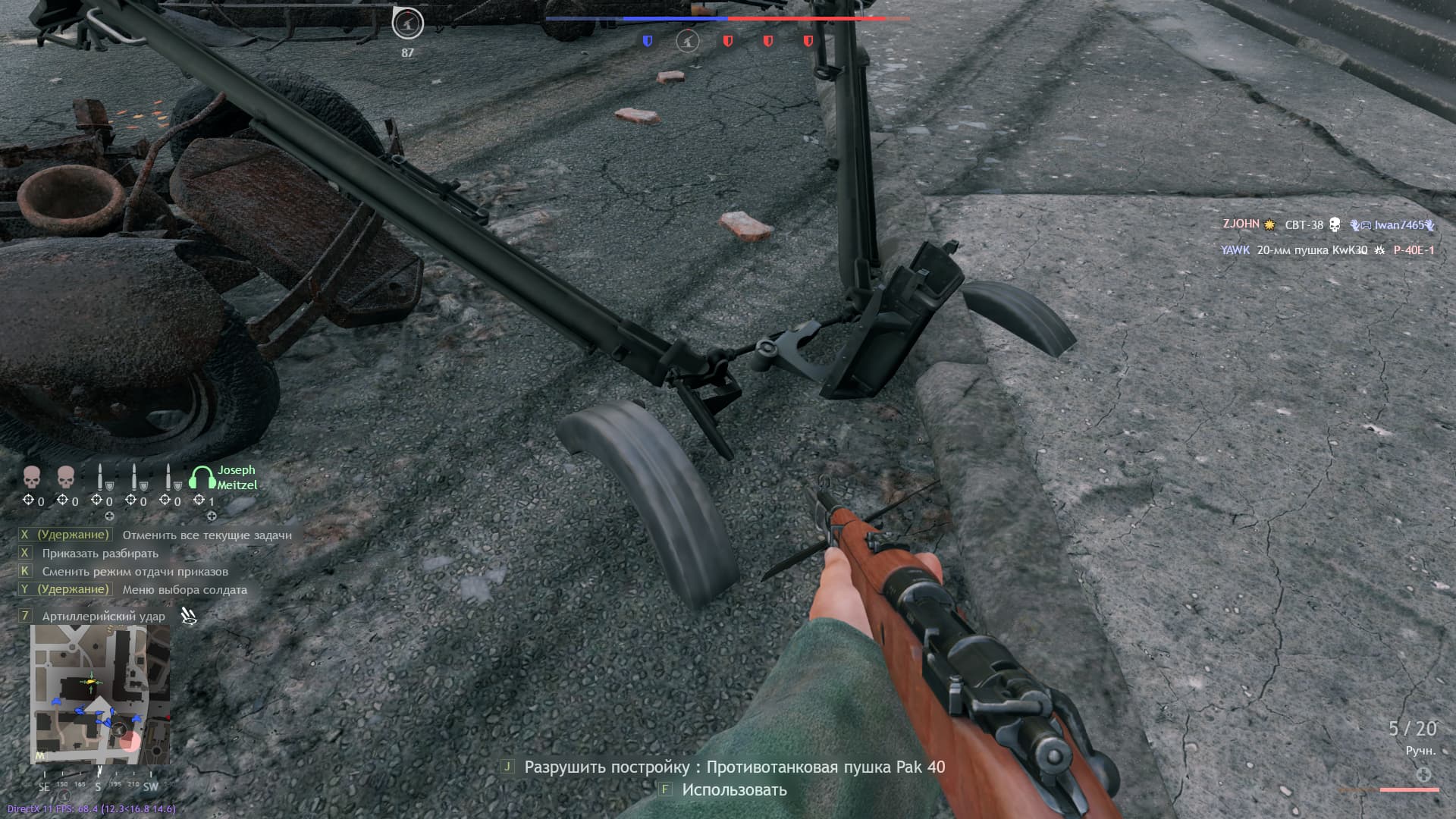 много сбить мне не получилось (всего один Ил-2), поэтому я обратил внимание на вражеские танки, которые стояли на Площади Павших Борцов, и поставил на другом углу крыши ПТ пушку, но УВН у пушки не хватило, и стараясь обратить дуло на площадь, мой инженер грохнулся вниз вместе с пушкой, которая впоследствии застряла в текстурах: