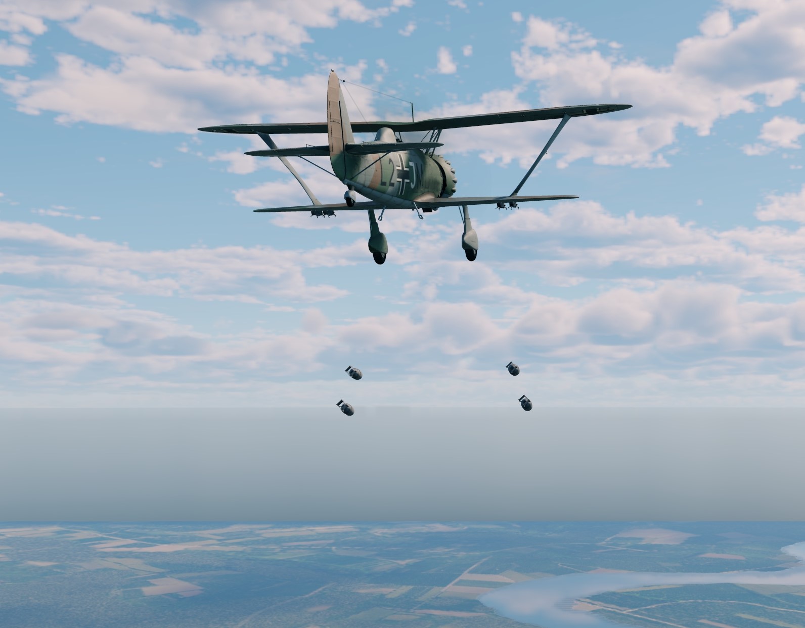 падающий биплан с бомбами