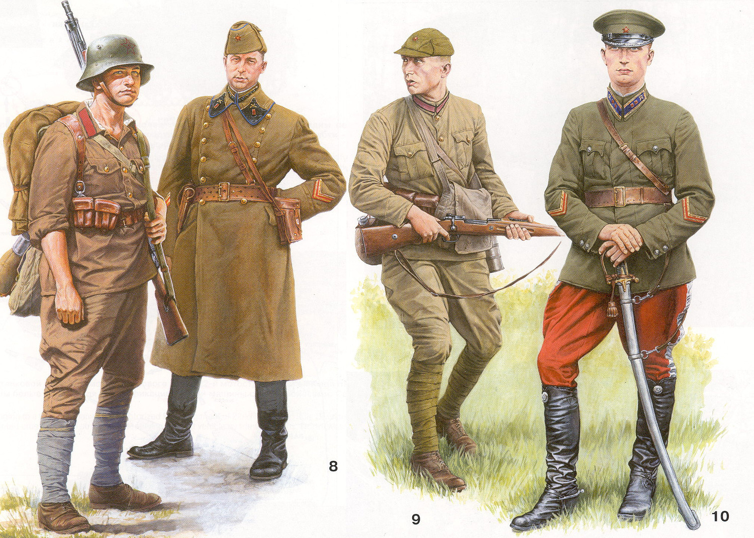 Эту форму затем оснастили стандартными советскими знаками различия и эмблемами Красной Армии. Это создавало характерный «гибридный» вид, особенно в 1941 году, где покрой и цвет гимнастёрки, стиль сапог и характерные фуражки оставались заметно отличными от стандартного советского образца.