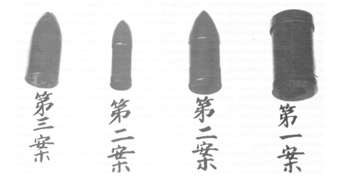 Противотанковые гранаты слева направо: для гранатомёта Модель 3, для гранатомёта Модель 2, для гранатомёта Модель 2 для гранатомёта Модель 1.