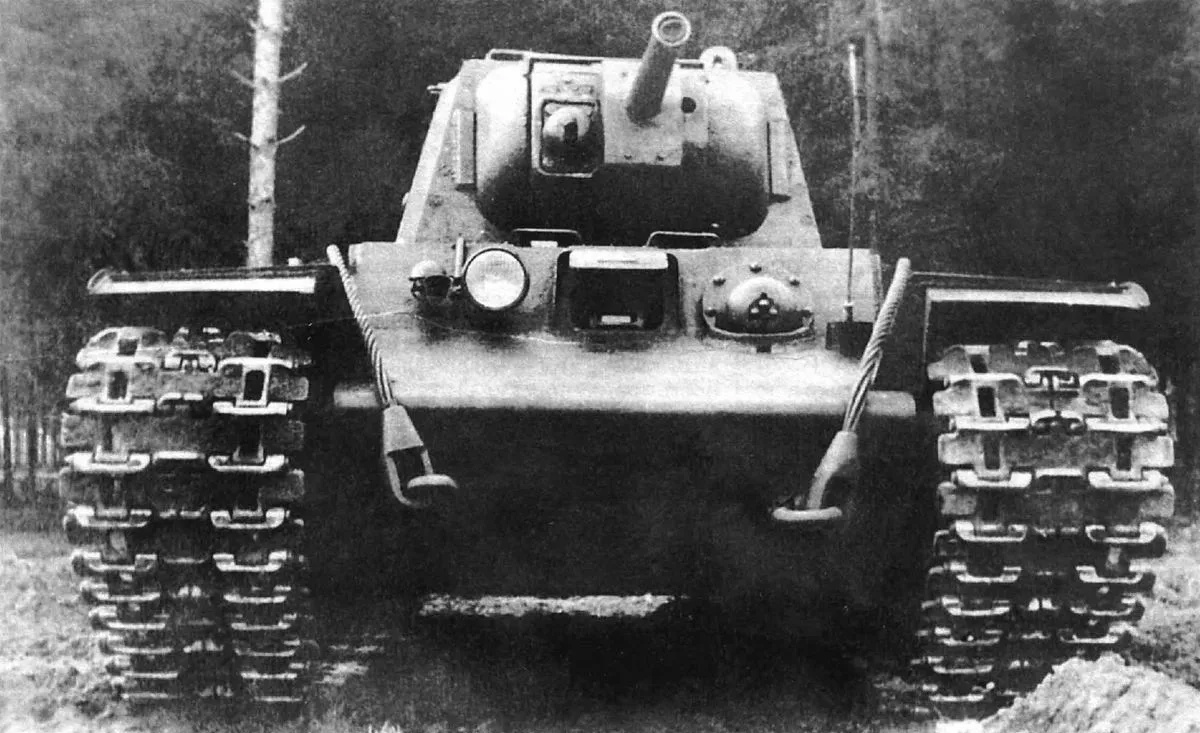 Трофейный КВ-1 с огнемётом, помеченный немецким балочным крестом. По левому борту не хватает одного опорного катка;