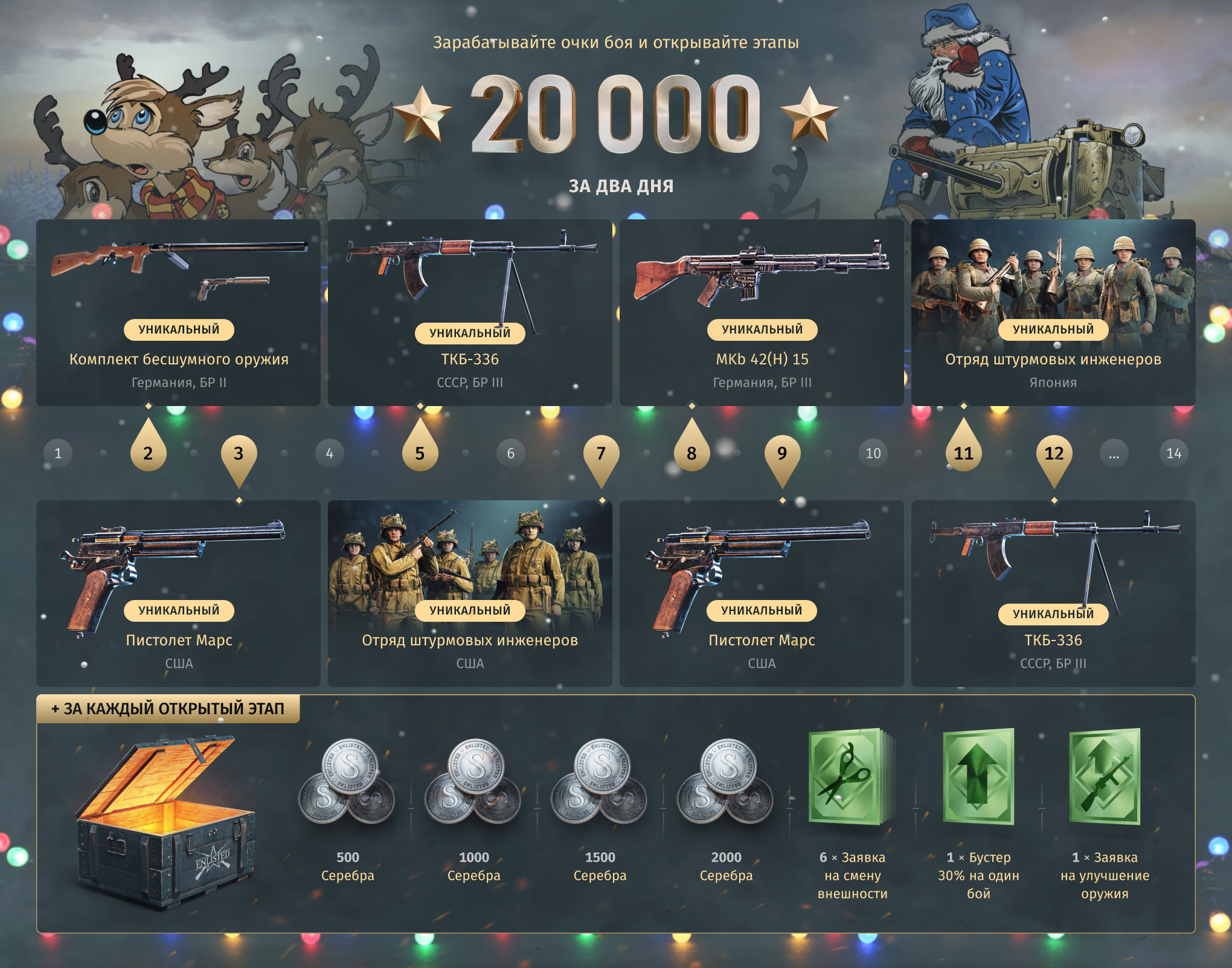 Помимо штурмовых инженеров в этот раз вас ожидают две яркие новинки: пистолет «Марс» для армии США и пулемёт ТКБ-336 для армии СССР. Но на этом праздничные награды не заканчиваются — у вас будет возможность получить комплект немецкого бесшумного оружия и винтовку MKb 42(H) 15.