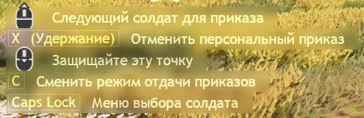- Т.к. в одном из предложений выше была предложена аж целая еще одна строчка иконок, предлагаю при индивидуальном режиме отдачи приказов вместо зеленого указателя использовать разукрашевание иконки солдата, которому пойдет приказ, скажем, в желтый цвет. Или обводку какую. Также нужна возможность убрать назойливые подсказки между картой и отрядом, не затрагивая, например, подсказку о возможности раскинуть сошки.