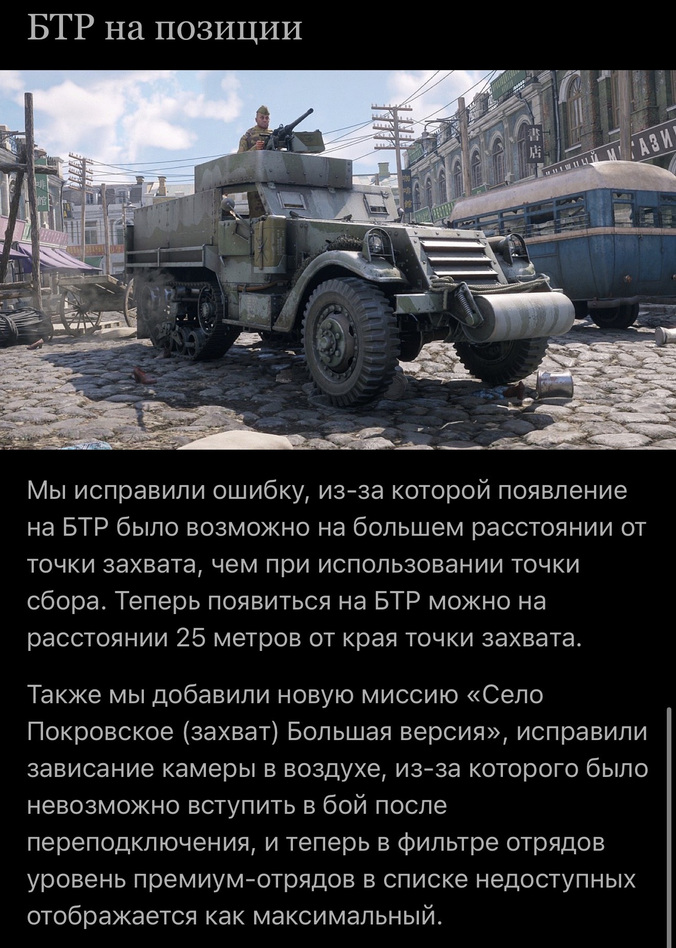 Не, справедливости ради можно, например, пофиксить, конечно, но дать возможность донатные бтры ставить прям на точку вне зависимости от момента боя. Думаю, такую идею по достоинству оценит @Zakin. Это и логичнее - пехота с условных блицев должна была “развертываться” несколько дальше от прямого огневого контакта с противником, чем ганомажий десант. По объективным причинам в виде бронированности ганомага и отсутствия бронированности кузова блица