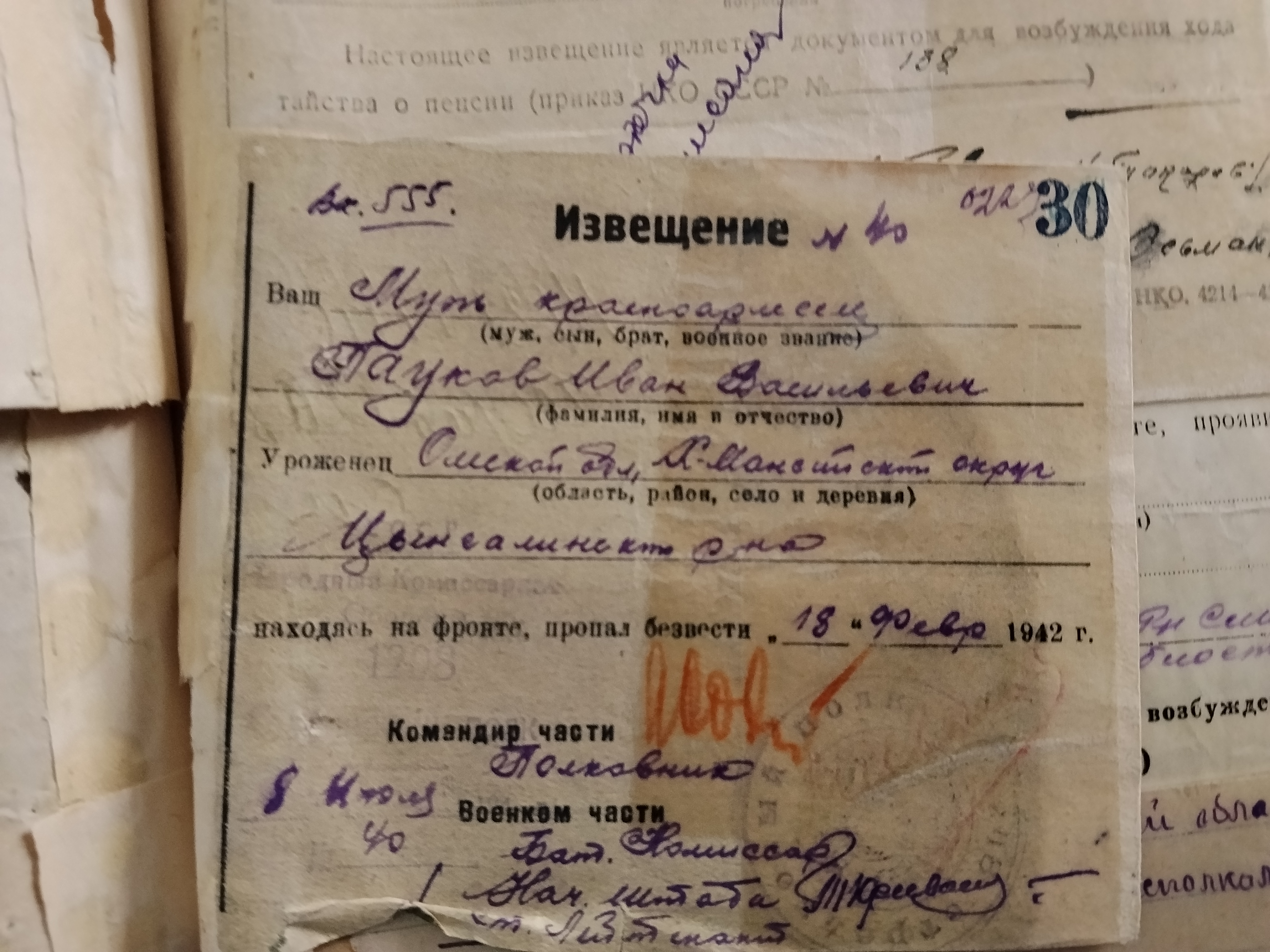 Похоронка сообщающая о смерти Паукова Ивана Васильевича 18 февраля 1942 года.