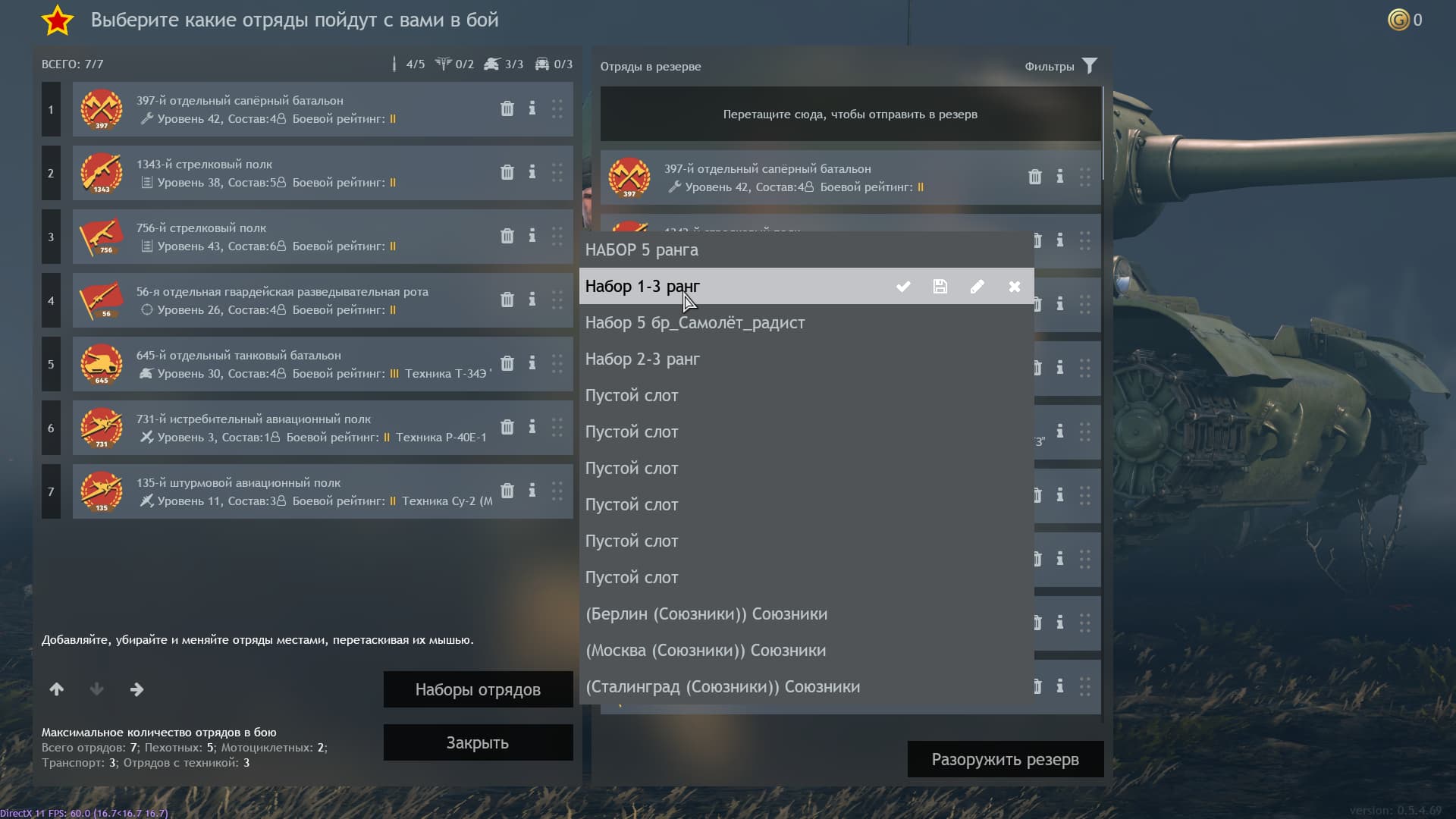 4 Переработать интерфейс отрядов( добавить возможность выбирать свой “сетап боевого рейтинга”, условно играя на 5 ранге, я хочу поиграть на 2 и просто перелючая кнопкой Изменить сетап выбираю ту “колоду отрядов” которуя я заранее настроил для 2, и мне больше нет необходимости переодевать оружие всем солдатам и технику отрядов