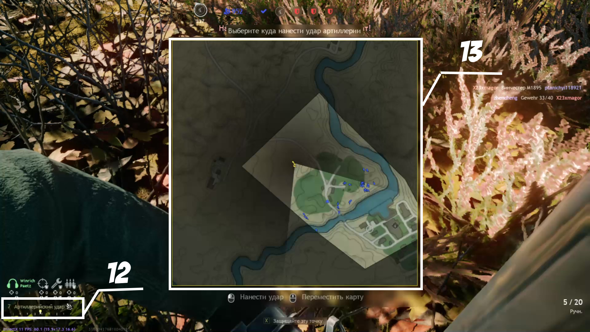 12 - Статус артиллерии (Готова \ не готова) И так же кнопка его вызова (по умолчанию “7”)
