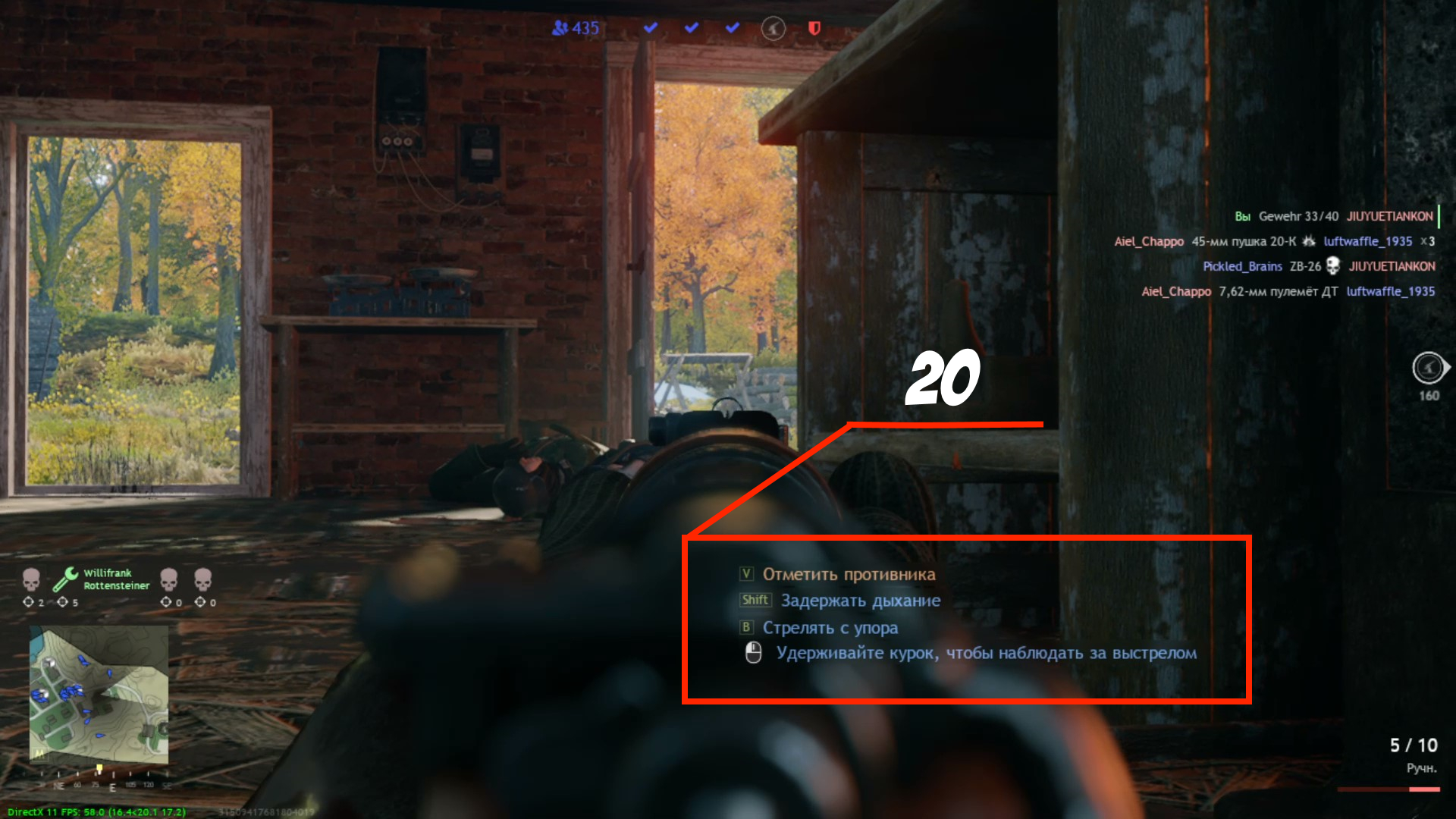 20 - Дополнительные подсказки во время прицеливая. О том что можно отмечать противника “V”, задержать дыхание “Shift”, Стрелять с упора “B”, следить за выстрелом левая кнопка мыши.