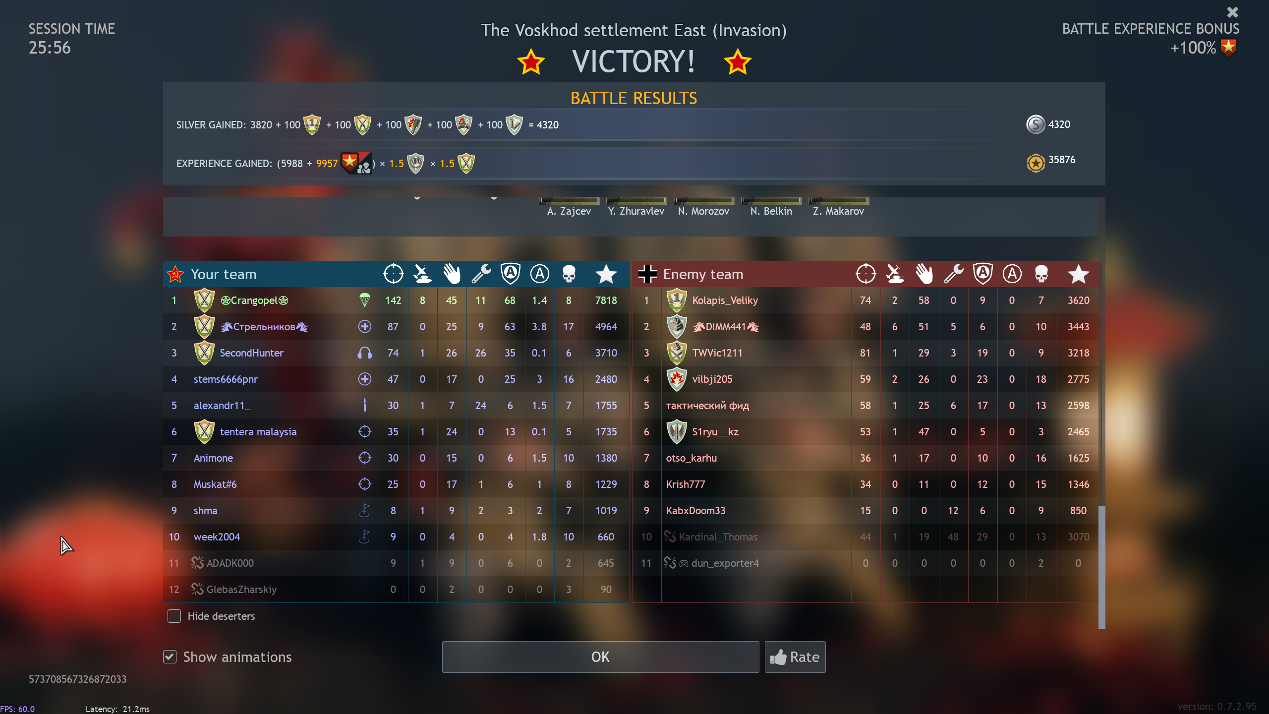 Всё звучит хорошо, но сложно. Например, зависимость очков от БР (бойцы на 5бр и бойцы на 1бр - две большие разницы), от прокачки каждого отряда каждого игрока, от очереди, в которую попал, от карты и т.д. не невозможно, конечно, но и не иф…елсе пару раз прописать, гораздо сложнее.