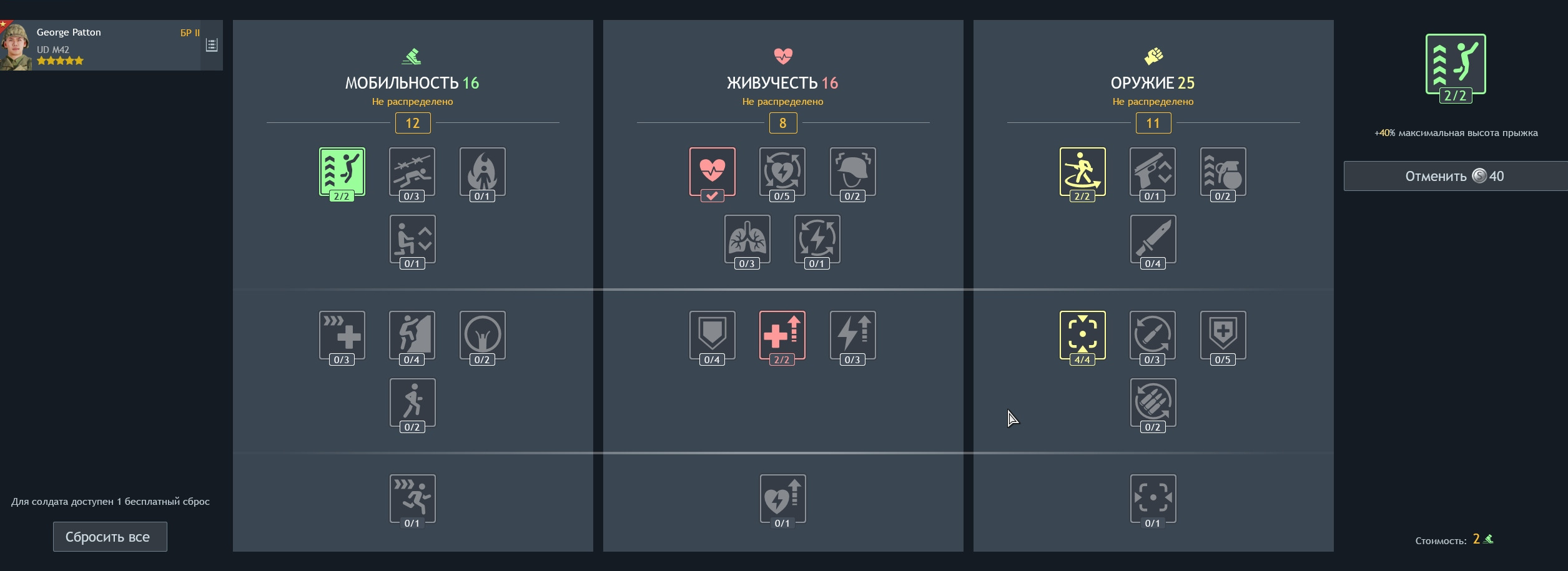 Спринт, живучесть с выносливостью и 4 уровня рукопашки. И так всех.
