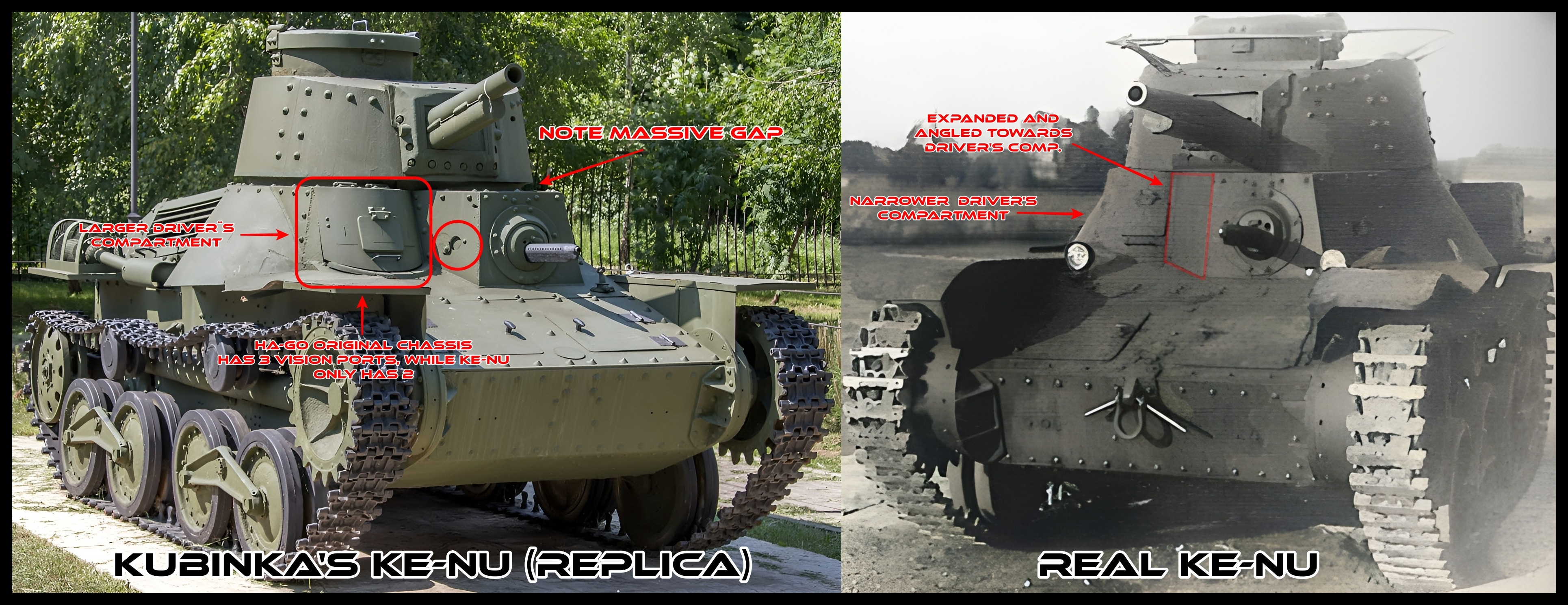 По сути это танк Ha-Go с башней от Chi-Ha Kai. Японцы также и ставили башню и от обычного Chi-Ha с 57-мм пушкой, но это на не интересно. Как итог Ke-Nu как и Ke-Ri (вариация с 57-мм, или на оборот) хоть и получили повышенную огневую мощь, но потеряли скорость и имели максимальную скорость до 40 км/ч. Броня корпуса от Ha-Go осталось такой же, как и броня башни от Chi-Ha Kai.