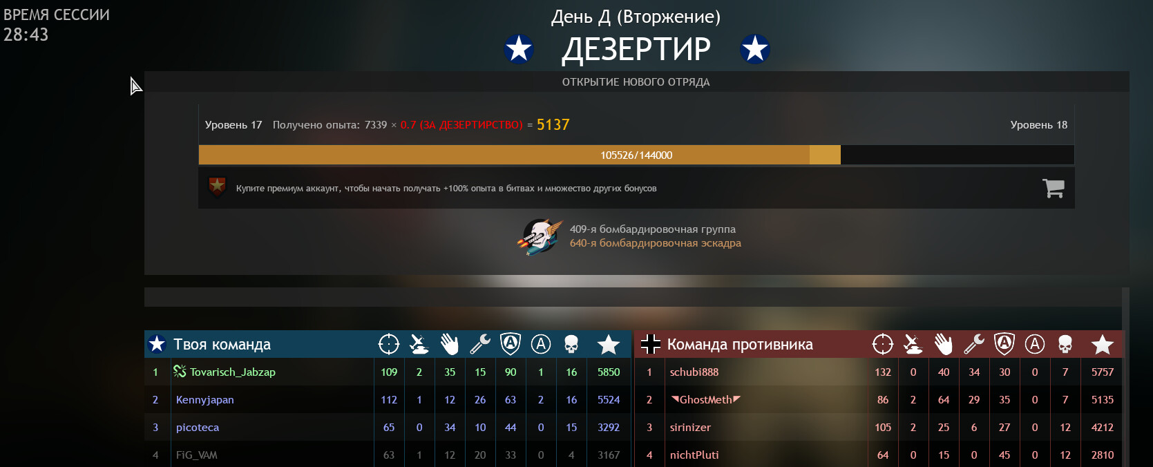 Я вышел не дожидаясь и получил дезертира с 0,7 опыта, хотя набил его больше всех. 1 место в своей и на соточку выше первого места противника.