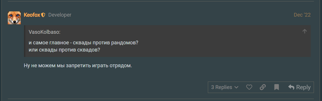 Прошу рассмотреть просьбу. скорее всего старые и опытные мастера игры закидают меня какашками из своих милых ручек. но сколько можно??? почему спаяные отряды в 3-4 игрока на одной стороне всегда??? сделайте как в мире танков - взводы против взводов, потому что когда ты играешь за себя и на победу, а против тебя на победу играет 4 хорошо сыграных человека - шансов у тебя 0.