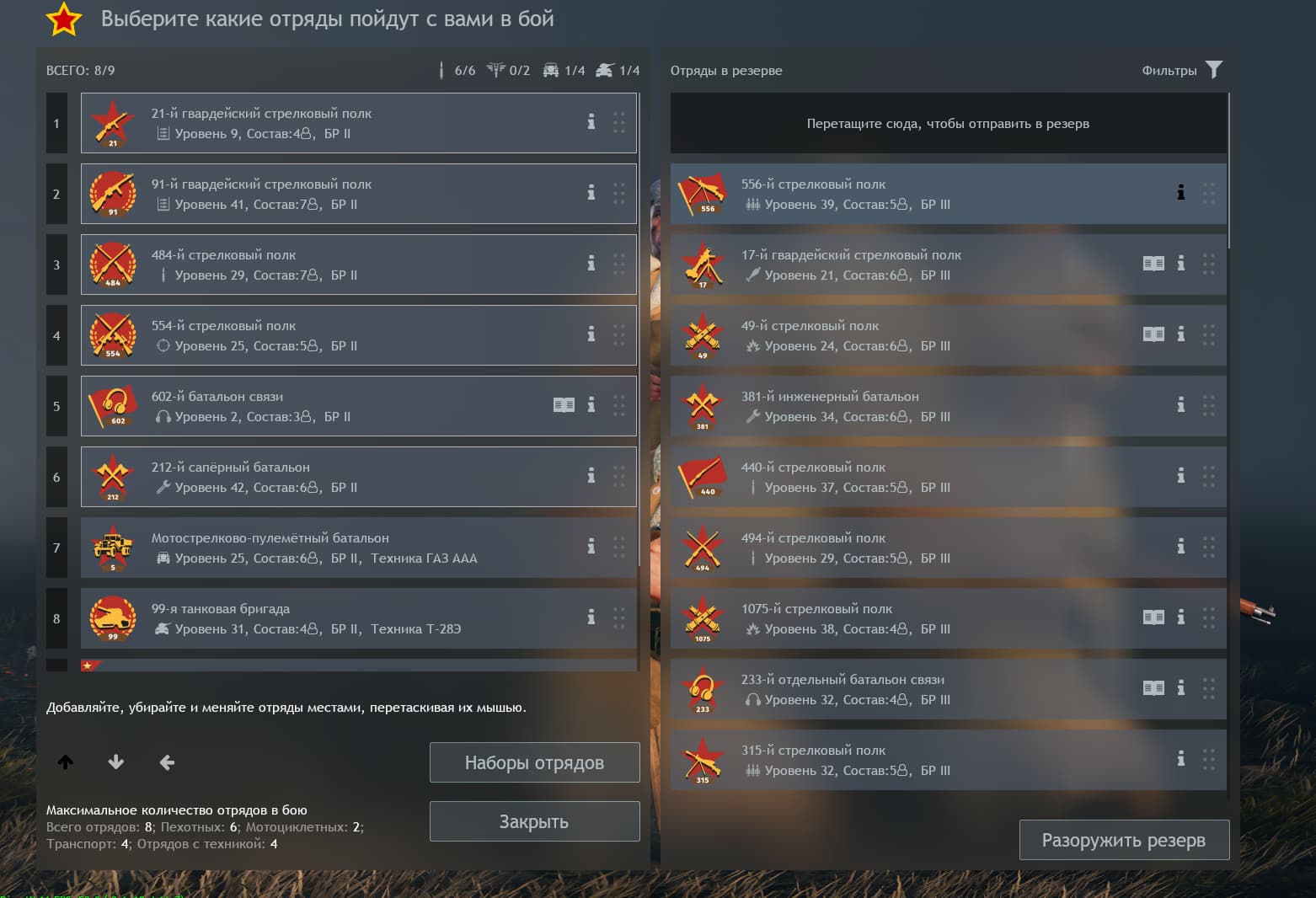 И тут я понял, чтобы мне их найти, мне надо каждый отряд из резерва перетащить в активную “Выкладку”… прощёлкать каждого бойца и снять Мосину вручную… Долго, нудно, скучно…