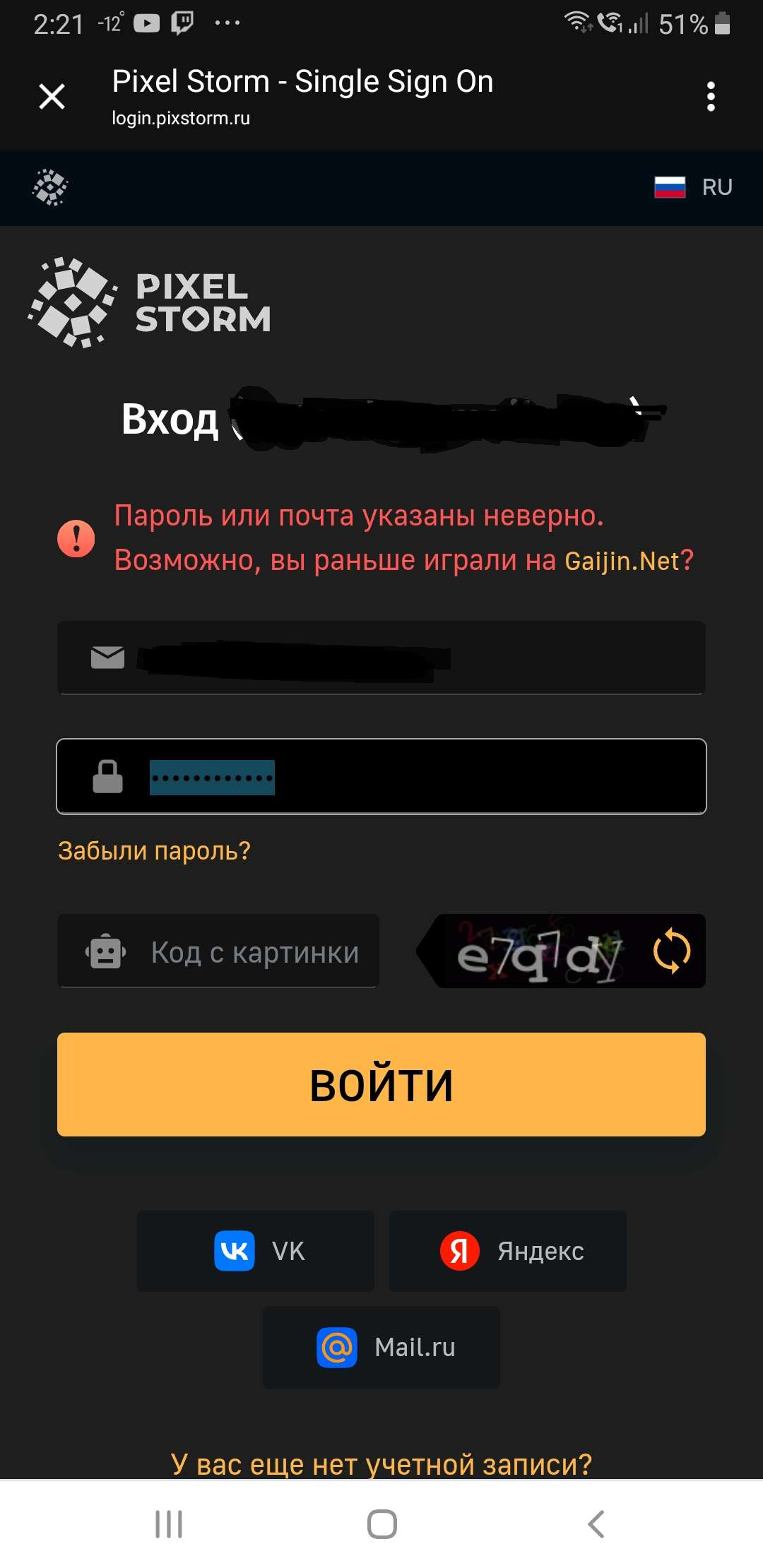 Я несколько раз вводил почту, пароль, капчу. Без толку.