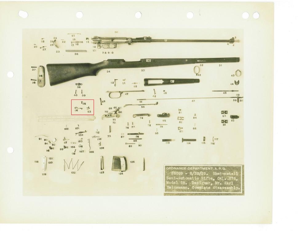 Когда в магазине заканчиваются патроны, подаватель (№123) под давлением своей пружины (№122) поднимается в крайнее верхнее положение. В этот момент он физически входит в зацепление с внутренним рычагом, который блокирует затворный механизм в открытом состоянии.