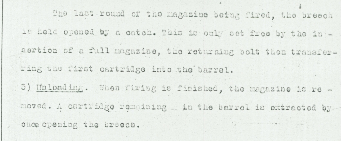 «После выстрела последним патроном из магазина затвор удерживается в открытом положении защелкой. Она освобождается только при вставке полного магазина, после чего возвращающийся затвор досылает первый патрон в ствол.»