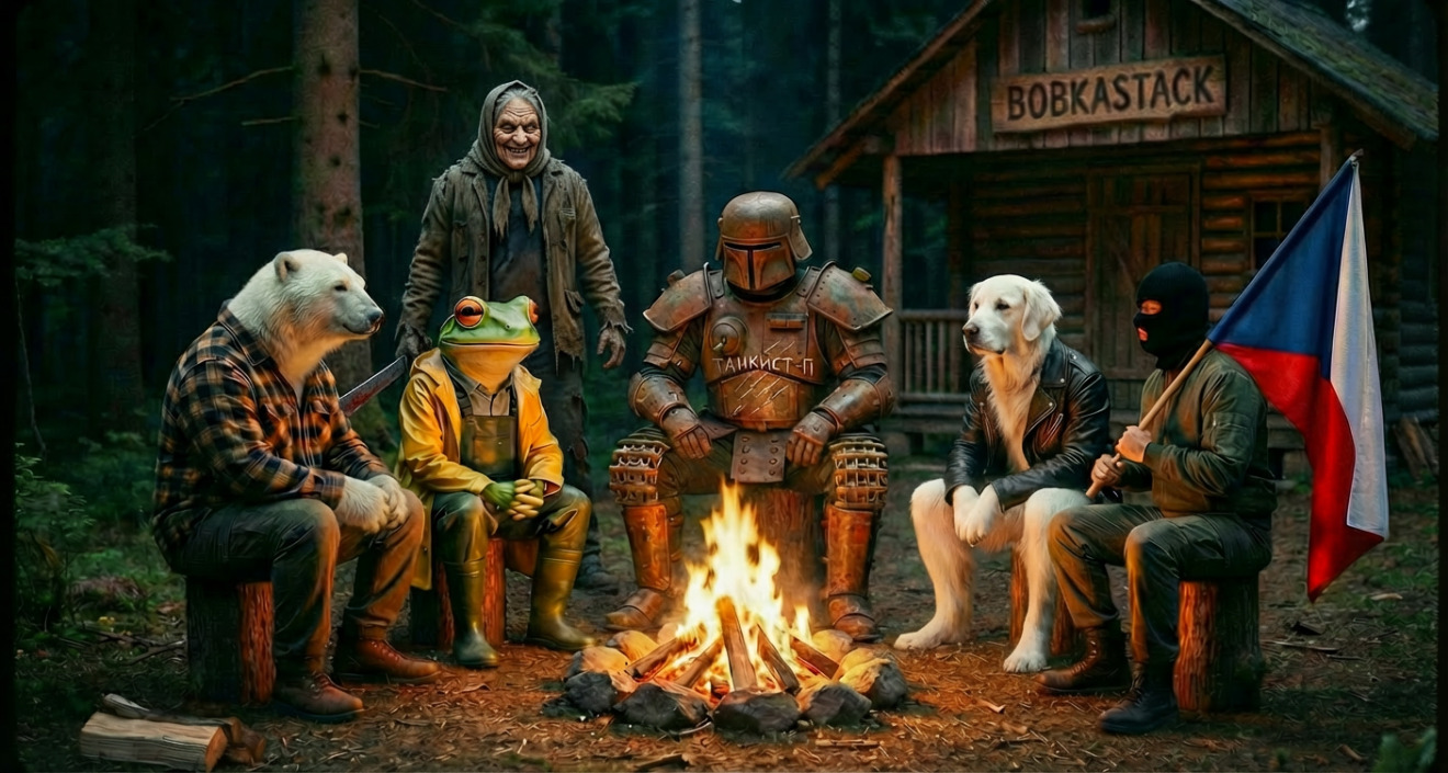 Какие-то новые персонажи. Это пёсоРокер с Марса, Инкогнито-чех и Мандалорец с пулеметом и люком мехвода в груди?